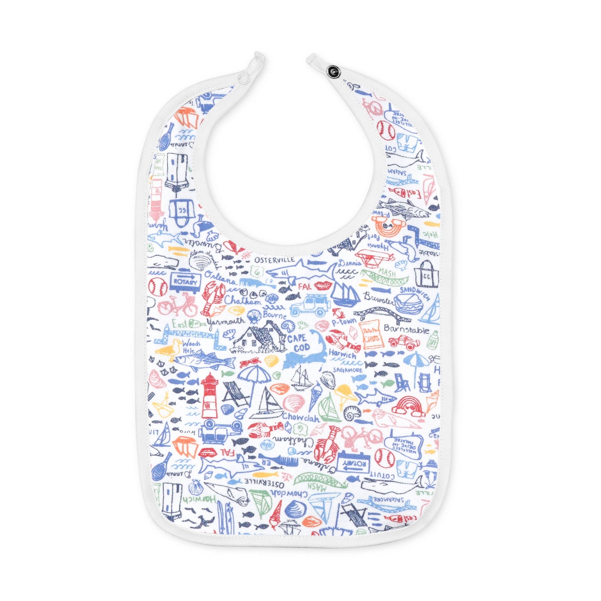 Our Cape Cod print bandana baby bib features all of our favorite Cape landmarks. Travel from town to town on our print and enjoy all things Cape Cod from ice cream cones to sailing and the beach!