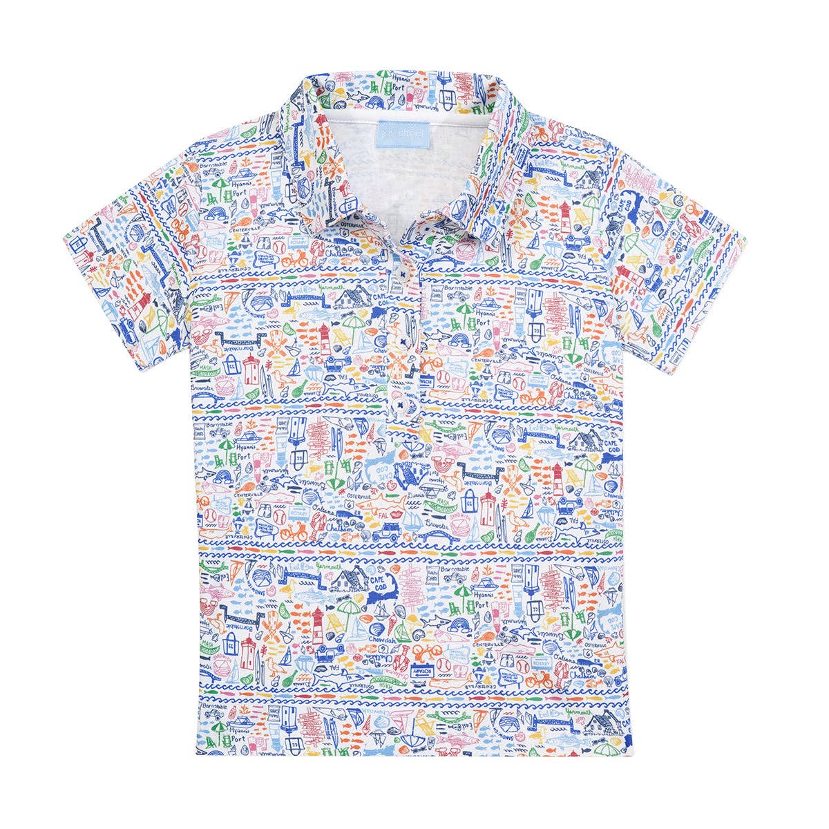 Our Cape Cod print polo features all of our favorite Cape landmarks. Travel from town to town on our print and enjoy all things Cape Cod from ice cream cones to sailing and the beach!