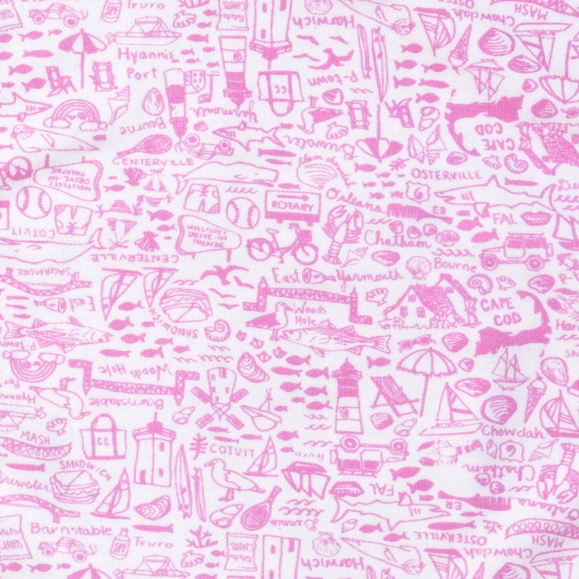 Our Cape Cod print zip baby onesie features all of our favorite Cape landmarks. Travel from town to town on our print and enjoy all things Cape Cod from ice cream cones to sailing and the beach!