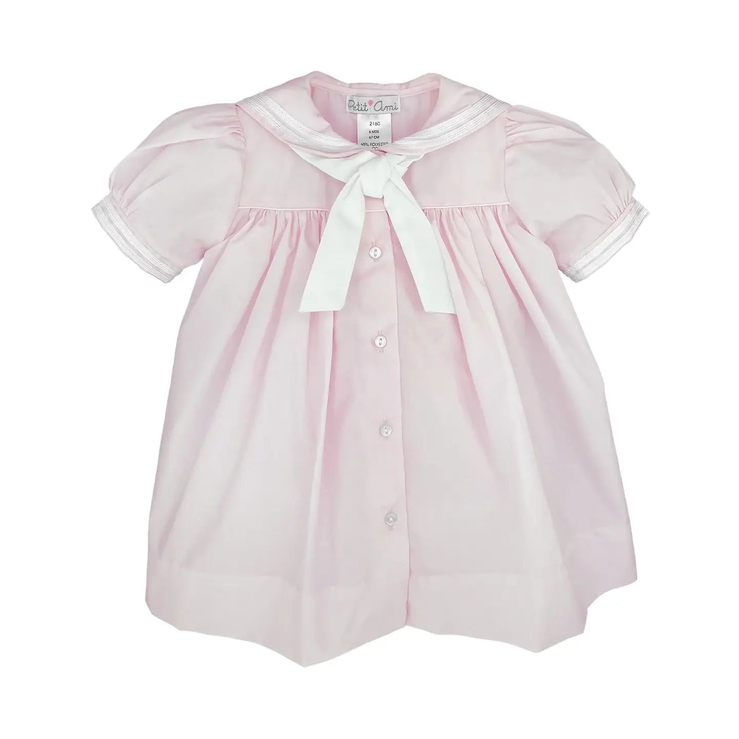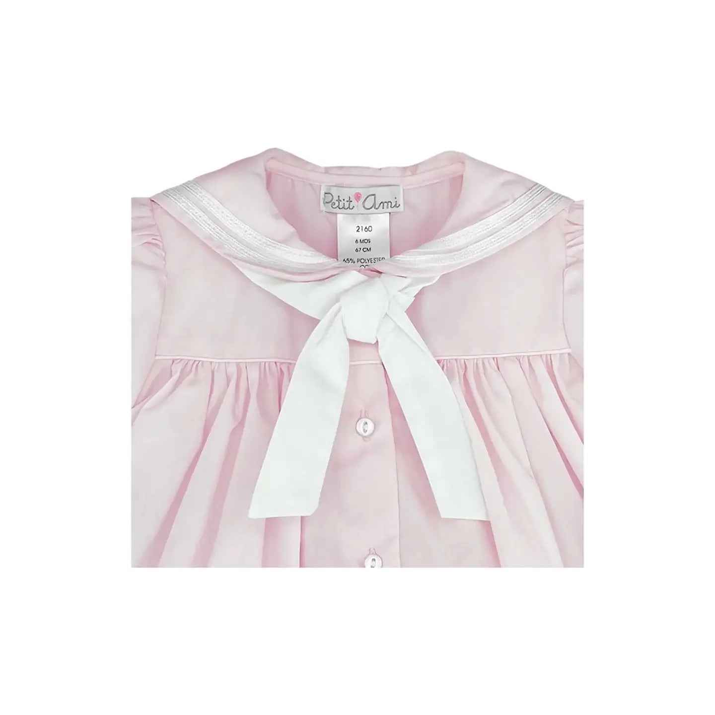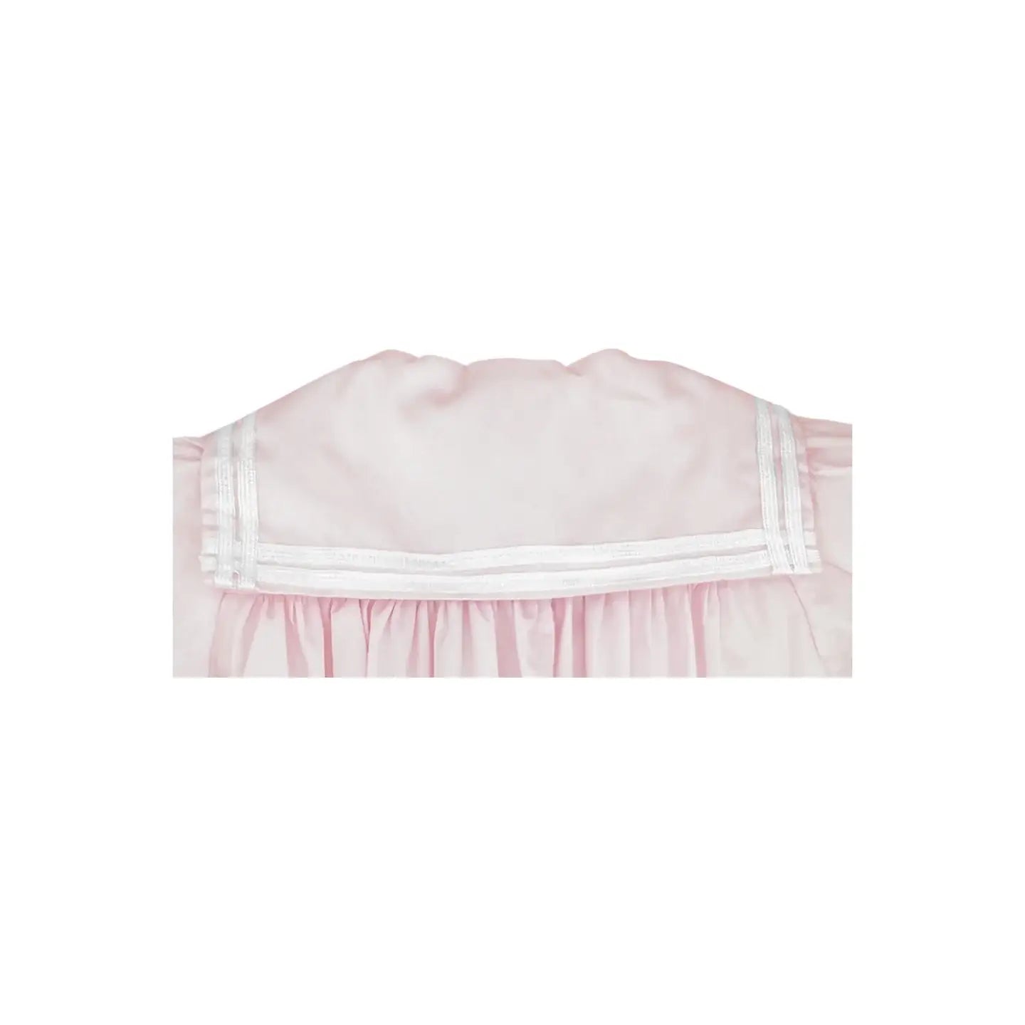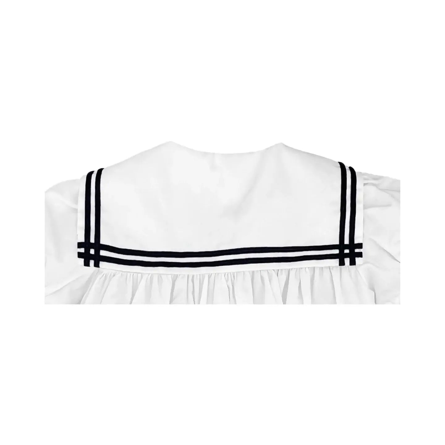 With a traditional sailor style collar with a tie and front button closures this piece is sure to become a treasured keepsake heirloom for generations to come.